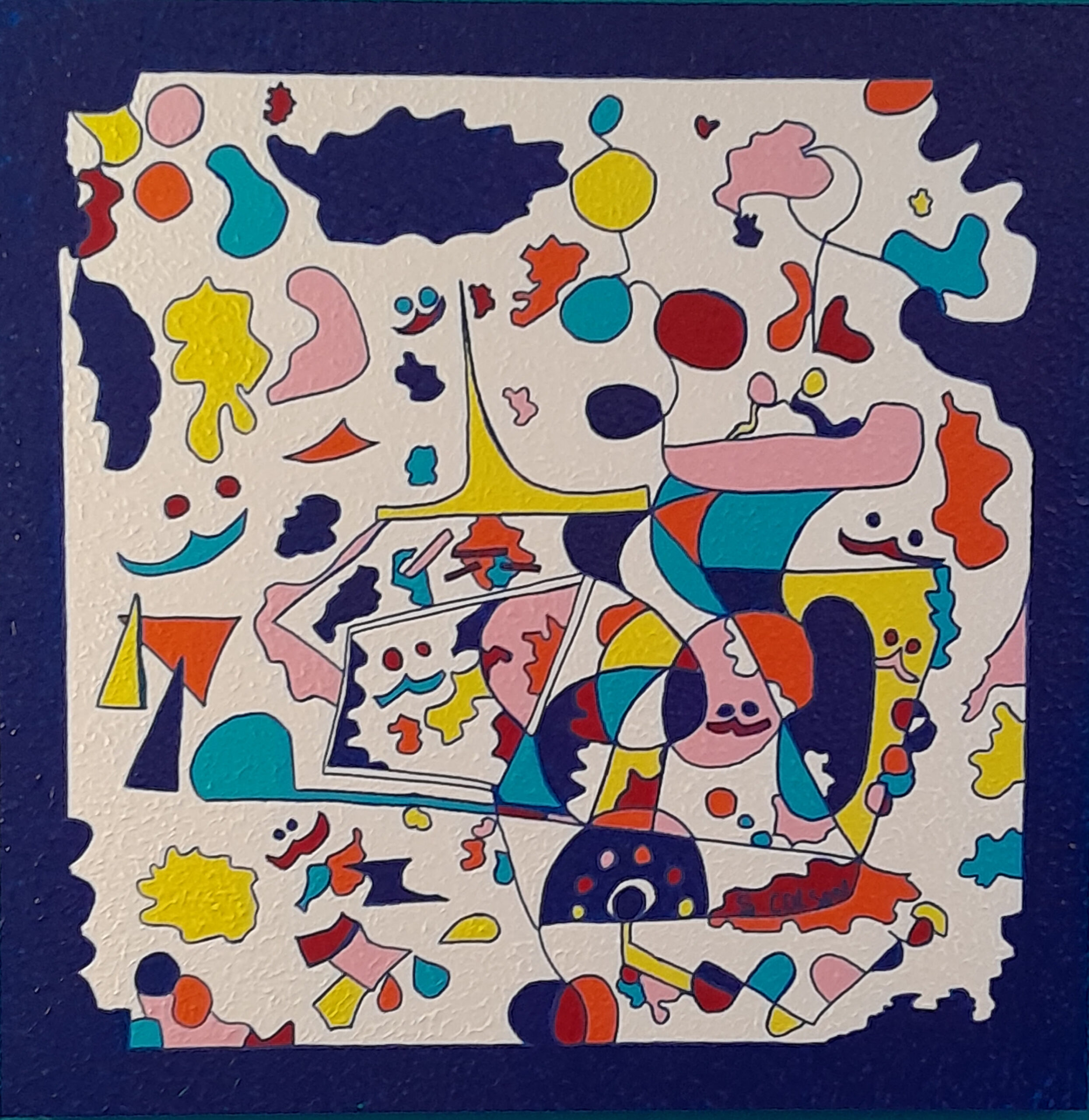 Les couleurs vives dominent l’ensemble de l’œuvre. Le jaune éclatant, le rouge intense, le rose doux et les nuances de bleu et de turquoise se répondent et créent un rythme visuel énergique. Ces teintes contrastées évoquent la fête, l’enfance et l’insouciance, tout en conservant une certaine harmonie. Le fond clair permet aux formes colorées de se détacher avec force, tandis que le cadre sombre qui entoure la toile agit comme une scène, renforçant l’idée d’un spectacle en cours.